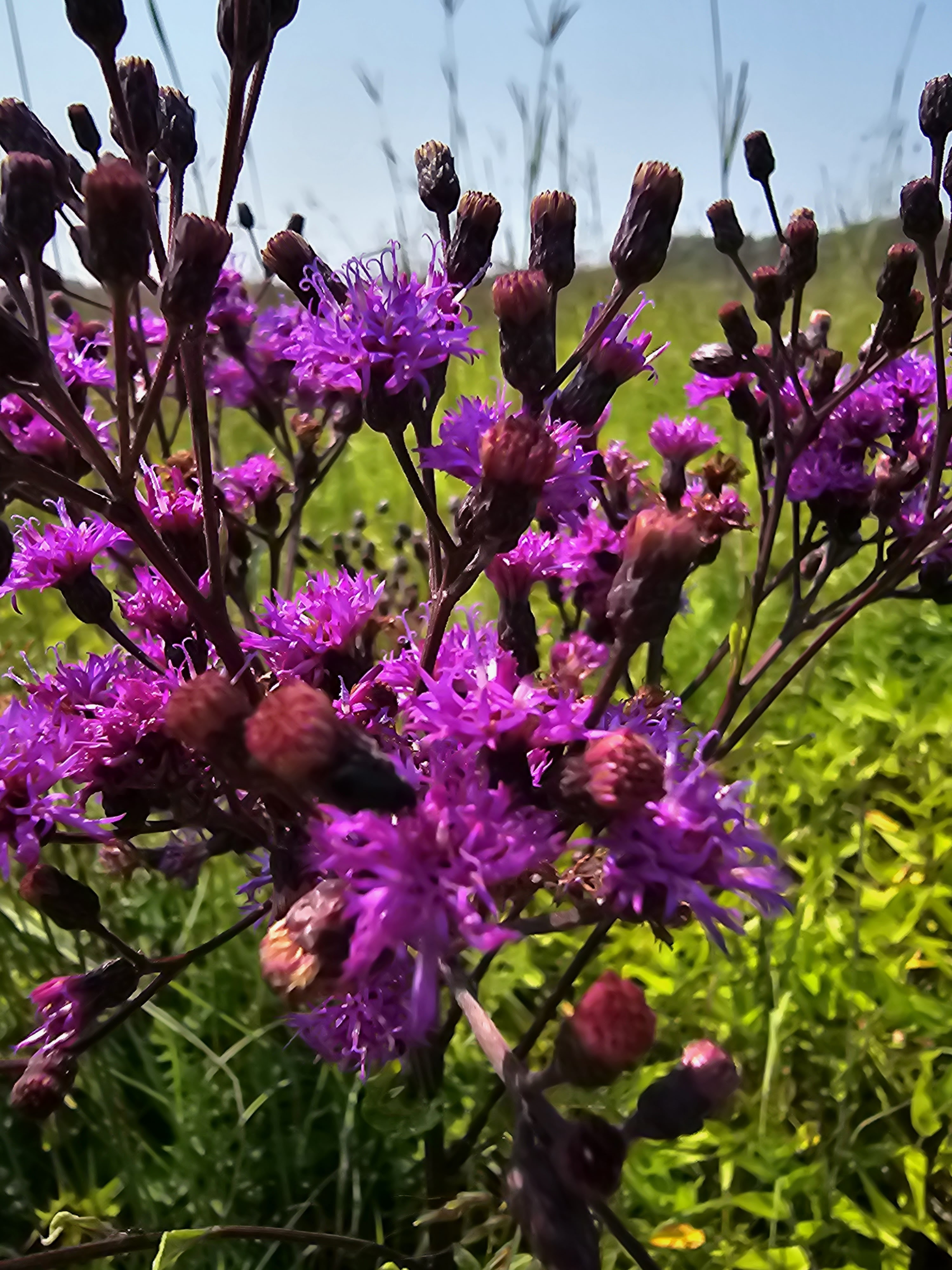 Ironweed (Vernonia gigantum described) is a beautiful tall purple flower which is a cluster atop a giant, up to 10 ft tall, spike. The flowers are button shaped. The leaves are ovate shaped and up to 10 in long by 2 in wide and are slightly serrated on the edges. It blooms from July – September depending on conditions and species. It prefers full sun in moist soil. There are around 350 different species found in South America, Africa, Southeast Asia, and North America. Bees and butterflies love to pollinate this flower.